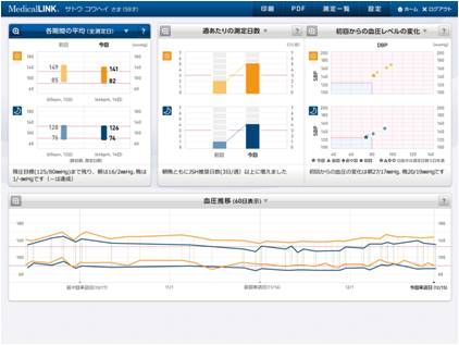 - メディカルリンクサーバーは、送られたデータから個人の血圧変動の各種グラフをインターネットを通じて医師のパソコンに瞬時に表示。
