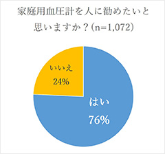 - 2人に1人が家庭用血圧計で測り始めて良かったと思うことは「体調管理ができるようになった」と回答。約8割が家庭用血圧計を人に勧めたいと思っている。