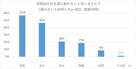 家庭用血圧計で測り始めて良かったと思うことを質問したところ、48.9%が「健康管理ができるようになった」と回答しました。自由回答では「安心感を持てる」、「気を付けることで健康診断の結果が良くなった」と回答している方も多く、体調管理につながる生活習慣改善などの行動変容が起きていることもわかりました。さらに、家庭用血圧計を人に勧めたいと思う人は76%にのぼり、「家族」に勧めたいと回答した方が57%、「友人」が46.6%と、家庭での血圧測定が健康管理ツールとして定着していることがわかりました。