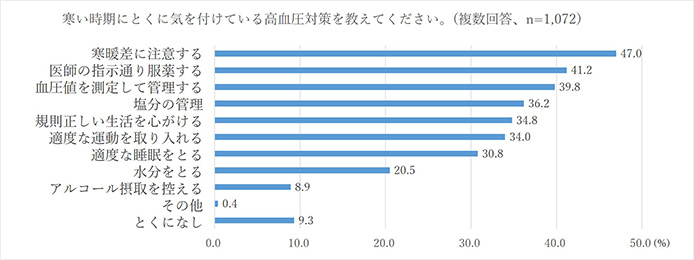 - 寒い時期に特に気を付けている高血圧対策は「寒暖差に注意する」。コロナ禍の今だからこそ気を付けている高血圧対策及び健康管理は「血圧値を測定して管理」が最多。
