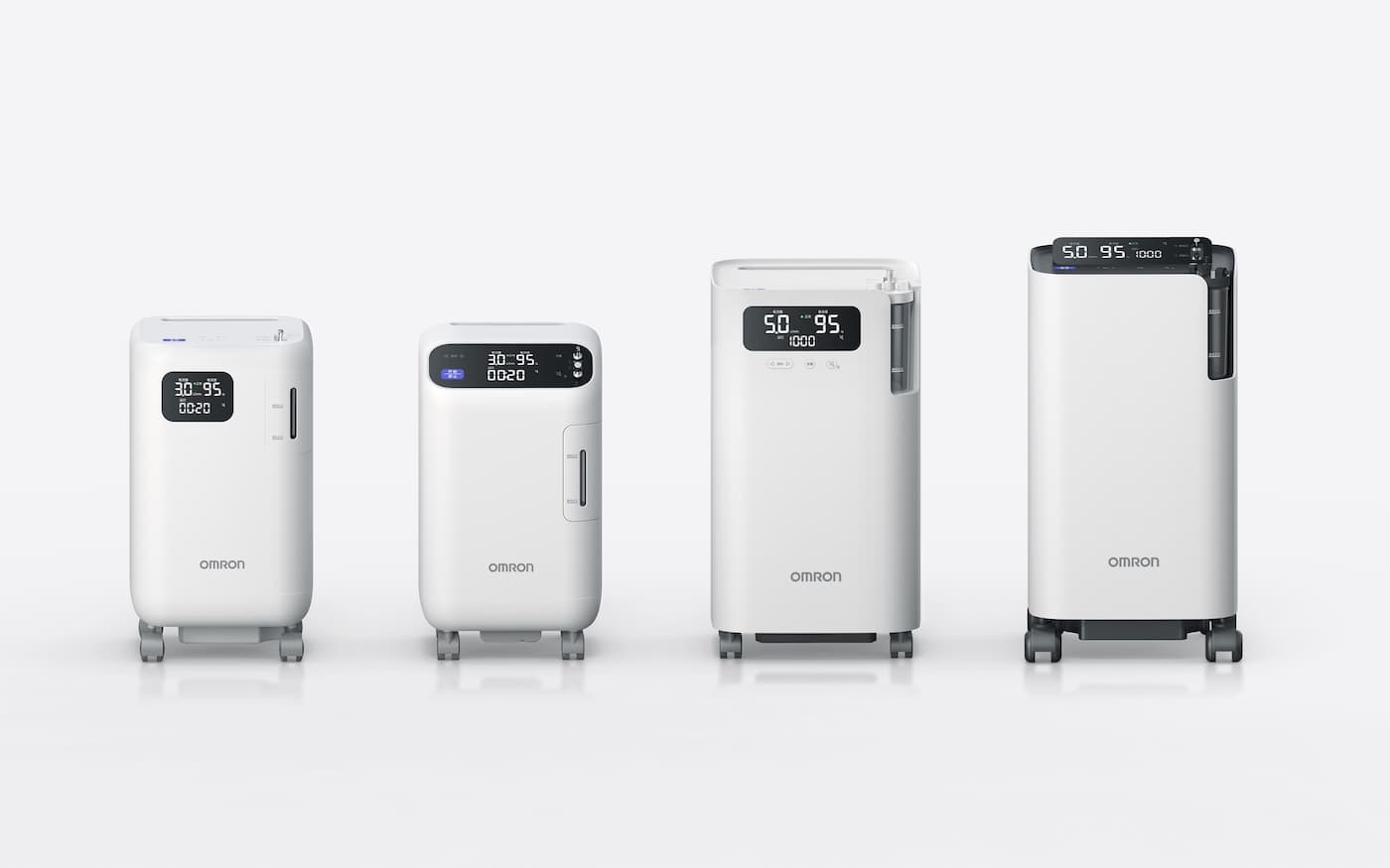 呼吸器疾患患者の在宅酸素療法向けの酸素濃縮器。自分が患者と思われたくない中等度患者向けの小型機種は、医療機器に見えないような全体を柔らかい印象の家電製品のような佇まいにデザイン。
