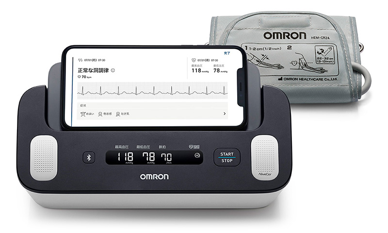 *心電図波形と解析結果を、スマートフォンアプリ「OMRON Connect(オムロンコネクト)」で確認できる携帯型心電計HCG-8010T1も展示します。