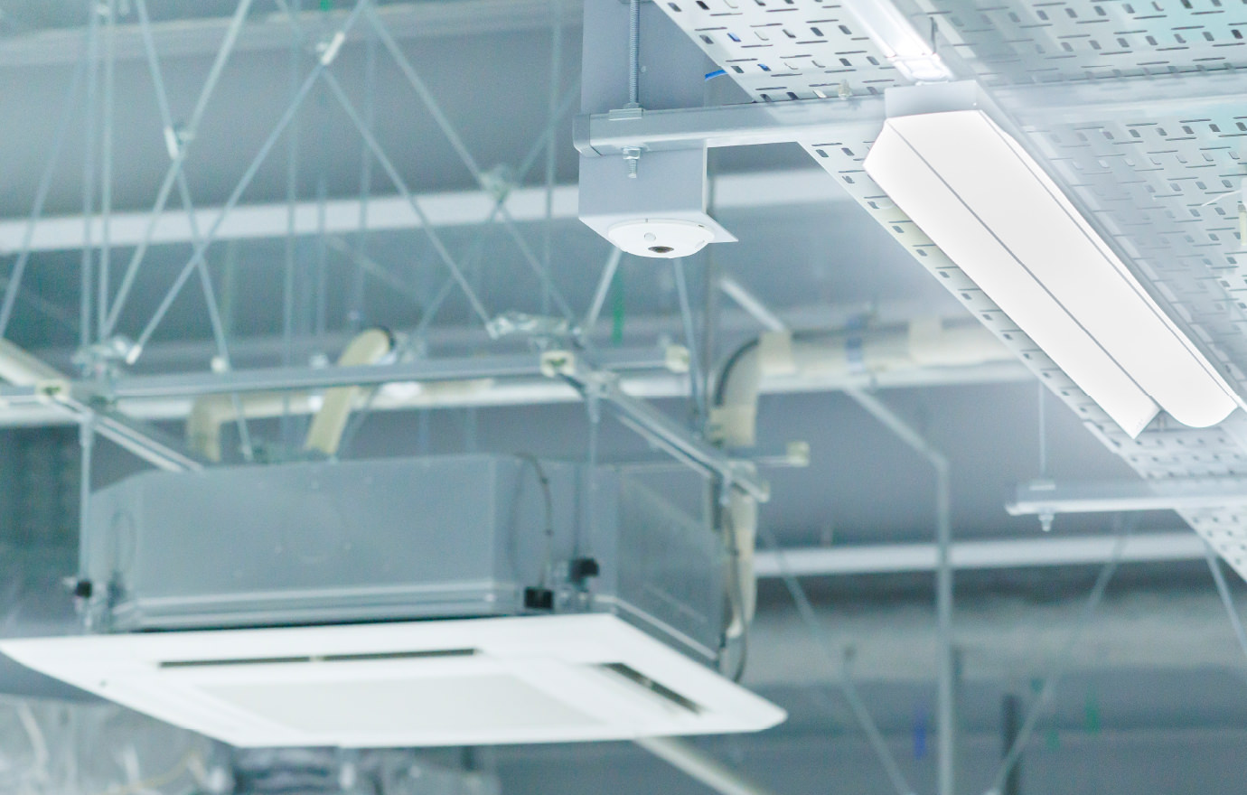 エリアの天井には画像型人感センサと室温度・CO2などの各種センサが設置されています。画像型人感センサは常に働く人を捉え、人の“位置”と“人数”を自動で検出。