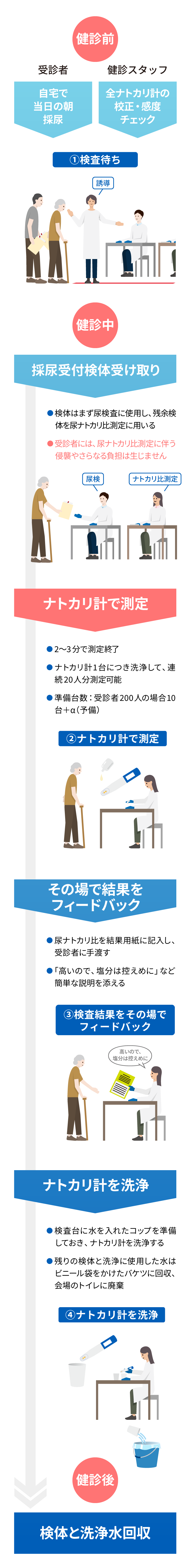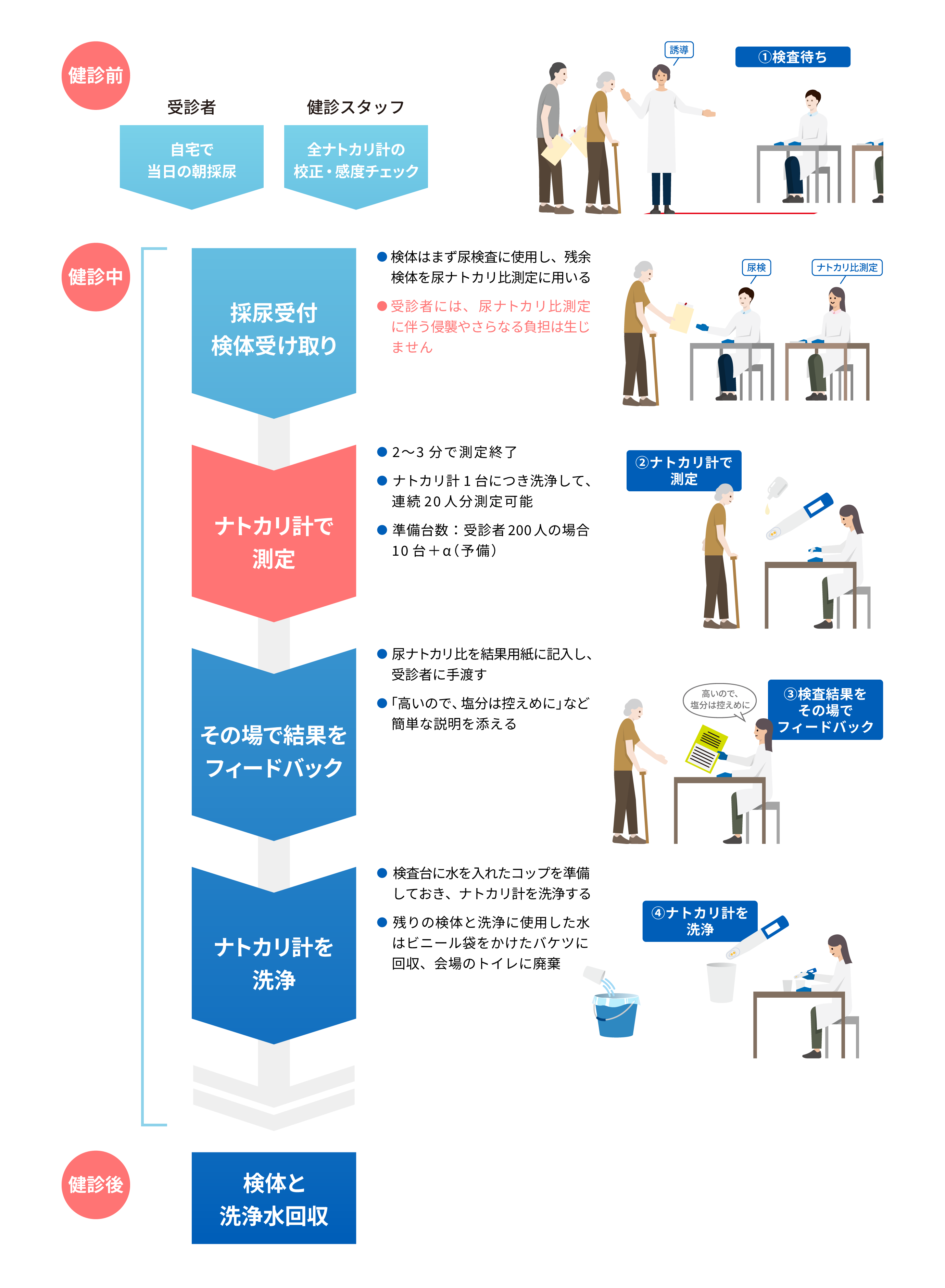 健診会場では住民同士の会話が広がり、減塩やカリウム摂取増加の工夫が自然に共有されていました。尿ナトカリ比測定は健診の流れに溶け込み、受診者へのさらなる負担はほとんどなく、会場のスペースと少人数のスタッフを確保できれば、運用はさほど難しくありません。登米市などの宮城県の取り組み結果から、尿ナトカリ比測定を健診会場などに取り入れることは、住民のみなさまの血圧改善と健康づくりにつながるものと期待しています。