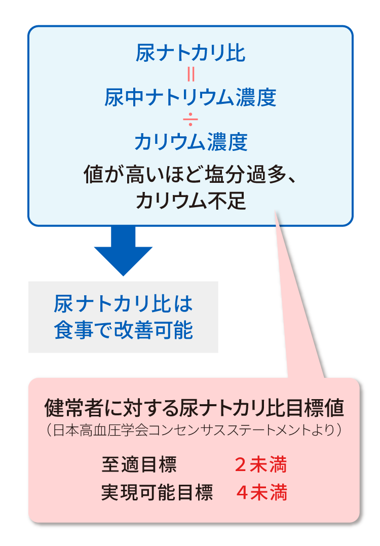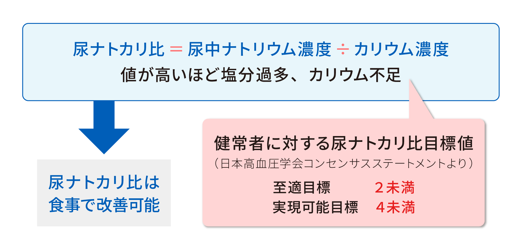 尿ナトカリ比は、食塩とカリウムのバランスを表すシンプルな指標です。健診で数値として示すことで、「自分は大丈夫」と思っていた方も、食事を振り返り行動変容へと至るきっかけになると考えられます。