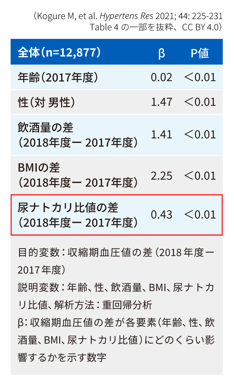 2018年度と2017年度の健診における収縮期血圧の差について、各要素がどのくらい影響するのかを解析。その結果、尿ナトカリ比の低下はBMIや飲酒量を考慮しても収縮期血圧の低下に関与することが示された。