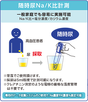 24時間蓄尿 : 個人の塩分(カリウム)量を把握することができるが、手間と時間を要する。